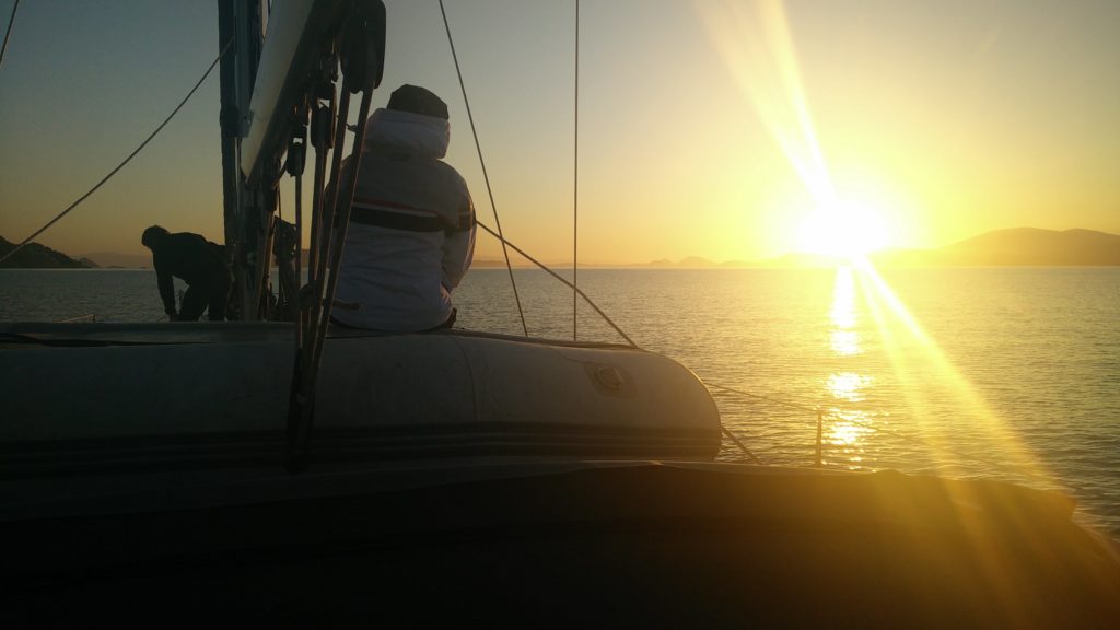 At 5:20 p.m., wind came back and we sailed under full sail to the eastern cape of Hydra. At 7 p.m. we started the engine again. We witnessed a nice sundown on our way to the bay of Mandraki (Μανδράκι) where we anchored in the bay at 8:30 p.m. For dinner we took our dinghy to a tavern on the shore. Trip distance for the day: 64NM.