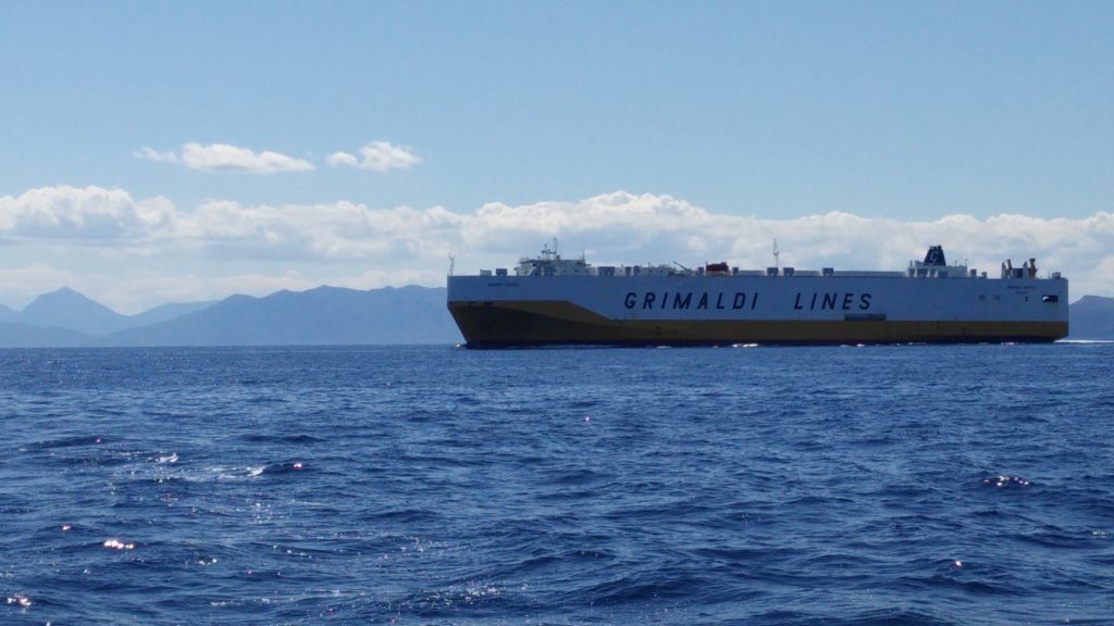 Two crews wanted to travel to the port of Aegina (Αίγινα) on the island with the same name and stay there. Us and the remaining crew wanted to anchor in the bay of Agia Marina (Αγία Μαρίνα) for the coming night. At 11:15 a.m., we took off and left Poros initially to the west, then turning onto a course of 55° towards Aegina. At 12:45 p.m., we changed course to the bay of Varkiza (Βάρκιζα) on the main land. To reach this bay, we had to cross the traffic separation zone between the port of Piraeus (Πειραιάς) and the open sea. We met and crossed the path of some big vessels.