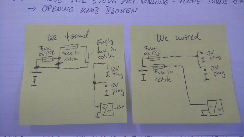 After using the multi-meter and following the wires, I sketched a short documentation of what we found and how we fixed it. I still have no idea what the person who installed that in the first place smoked or drank before doing so.