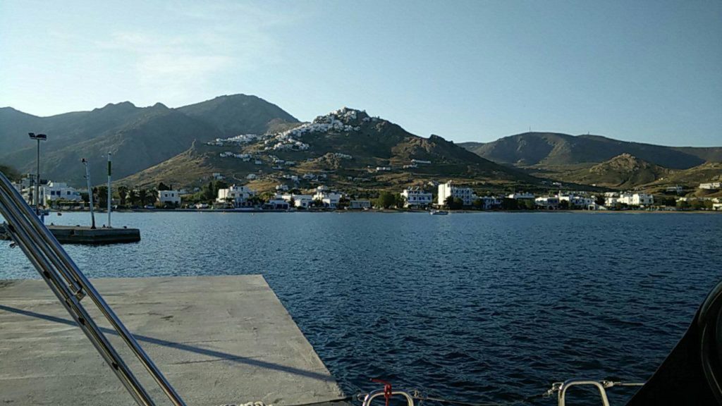 At around 1:30 p.m. we took off. The sea was calm and the wind was moderate. So we had an easy trip with some intermittent engine support to Loutra (Λουτρά) on the island of Khytnos (Κύθνος), which is ~28NM from Laurium . When we arrived at 7:30 p.m., the small harbor was already filled up with boats and yachts and one of our crews had to anchor in a bay nearby.