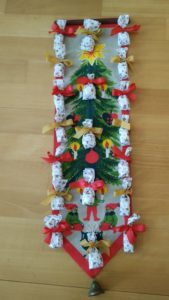 … may sometimes be a bit tricky. Since we were kids, my mom crafted an Advent calendar each year, one for each of us. The base of the calendar was the same every year: a piece of fabric with laces made out of gift ribbon sewed on to it. The gift ribbon is then used to attach small packets to the calendar which she fills with little things and which carry a number for the day they are supposed to be opened.